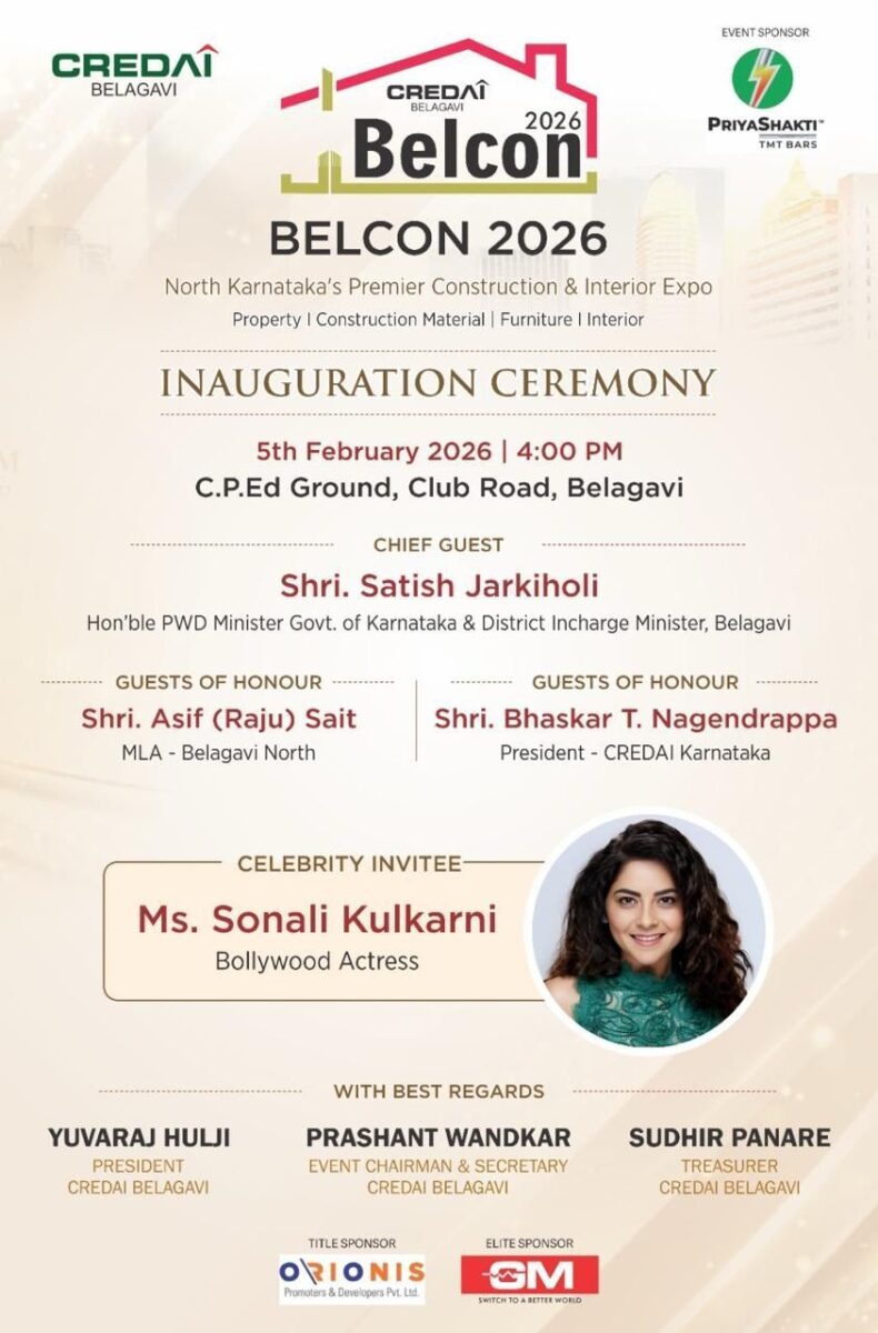 बेळगाव : ‘क्रेडाई बेळगावच्या ‘बेल्कॉन २०२६’ या भव्य बांधकाम आणि गृहनिर्माण प्रदर्शनाचा उद्घाटन समारंभ आज गुरुवार दि. 5 फेब्रुवारी रोजी सायंकाळी 4 वा. सीपीएड मैदानावर होणार आहे. कर्नाटक राज्यात बेंगळूरु नंतर बेळगाव शहरात प्रथमच अलिशान वातानुकूलित भव्य शामियानात संपन्न होत असलेल्या या प्रदर्शनाची बेळगावकरांना मोठी उत्सुकता लागली आहे. सार्वजनिक बांधकाम मंत्री व बेळगावचे पालक मंत्री सतीश जारकीहोळी यांच्या शुभहस्ते उद्घाटन होणार आहे.यावेळी आमदार आसिफ उर्फ राजू सेठ, कर्नाटक क्रेडाईचे अध्यक्ष भास्कर टी. नागेंद्रप्पा उपस्थित राहणार आहेत. प्रदर्शनाच्या उद्घाटन सोहळ्याला सुप्रसिद्ध अभिनेत्री सोनाली कुलकर्णी यांची विशेष उपस्थिती राहणार आहे.